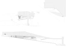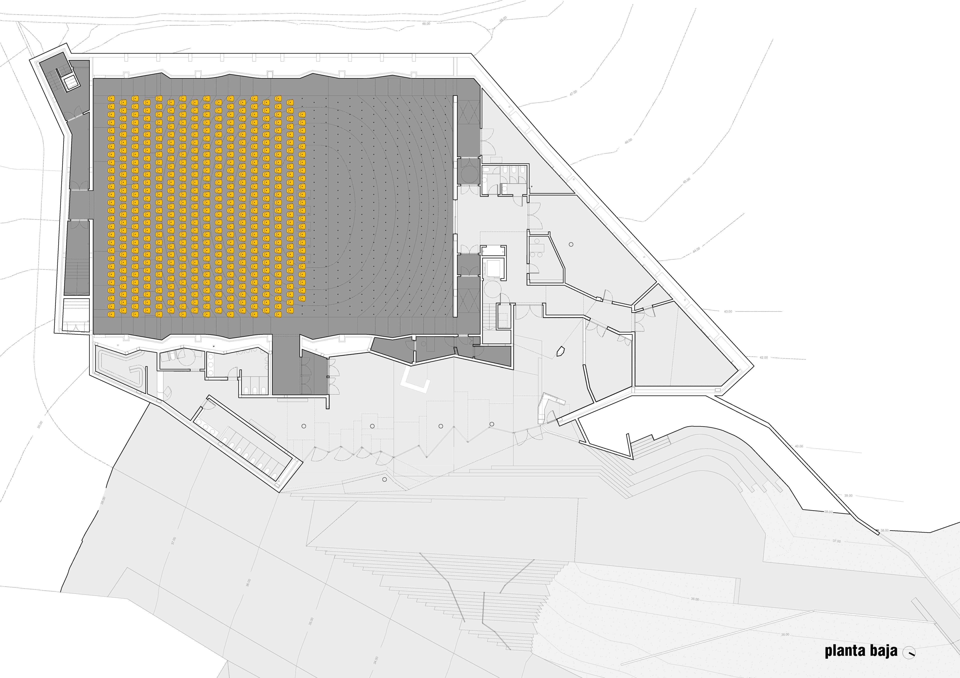 O locus, un monte inserido no centro urbano e parcialmente erosionado para o seu uso como aparcamento provisional, debía albergar agora un equipamento publico de Auditorio e Escola de Música nunha parcela estreita, limite entre o urbano e o espazo natural. Exponse uns muros crebados que suturan ese limite, recuperando a orografía do espazo natural por unha banda e resolvendo, coa edificación e a conformación do espazo publico, a conexión á trama urbana polo outro. Ao ser un municipio de pequena escala solicitábase un espazo flexible multiusos dentro dunha contención económica obrigada. Para iso resólvense as distintas tipoloxías mediante un sistema de butacas extraíbles e tarimas modulares. Este sistema permite, máis aló da flexibilidade, como permutador tipolóxico, un solución en continuidade cos experimentos teatrais dos anos 50 e 60 ata unha obra aberta como proceso operativo contemporáneo de simultaneidade ou indeterminación tipolóxica. A sala negra, completa a cámara negra da caixa escénica, encartándose ao mandato da acústica e deixando levitar a nube de paneis acústicos regulables.