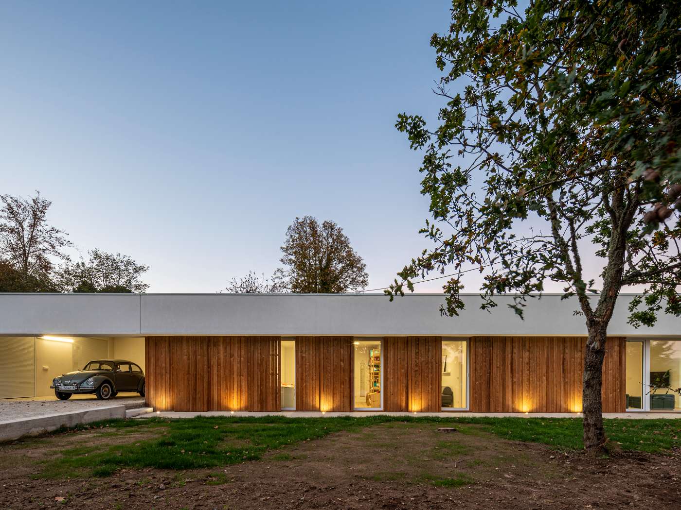 Trátase dunha vivenda certificada passivhaus de consumo enerxético case nulo, desenvolta en planta baixa, todos os espazos vivideros oriéntanse ao sur para mellorar o soleamiento, as aperturas teñen un sistema de contraventás practicables e un pequeno beirado para protección solar, a fachada norte que dá ao vial de acceso está practicamente pechada por completo, exponse un garaxe –espazo polivalente aberto situado na zona oeste da parcela, semienterrado e fóra da envolvente enerxética . Por outra banda dentro da envolvente hermética e súper illada sitúase a vivenda; co salón- cociña na párte sur –este proxectado con vistas cara á vila e cara á parcela, as habitacións tamén abertas ao sur e ao interior da parcela plantéanse como espazos polivalentes e transformables. A cuberta desta, axardinada, proxéctase como prolongación vexetal da parcela, axudando a integrala mellor no territorio. O proxecto a nivel conceptual podería definirse como un pequeno e amable contedor de madeira e vidro, envolto por outro contedor branco e vexetal incrustado no terreo, coma se fose parte deste.