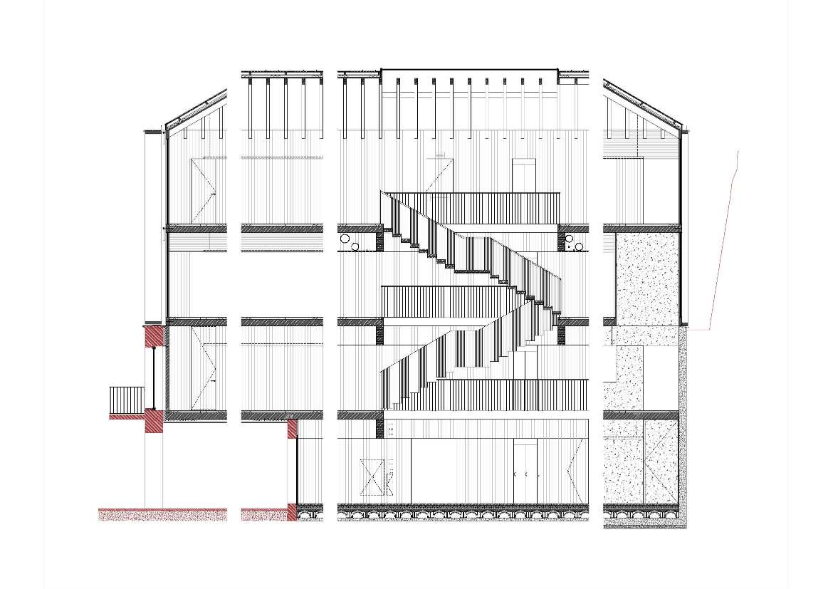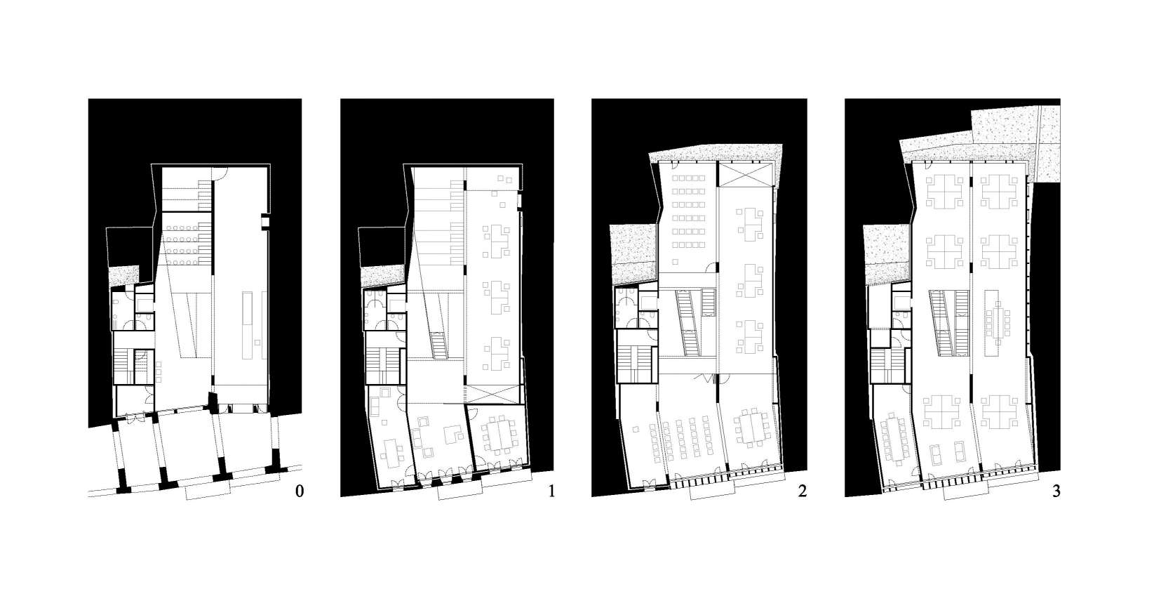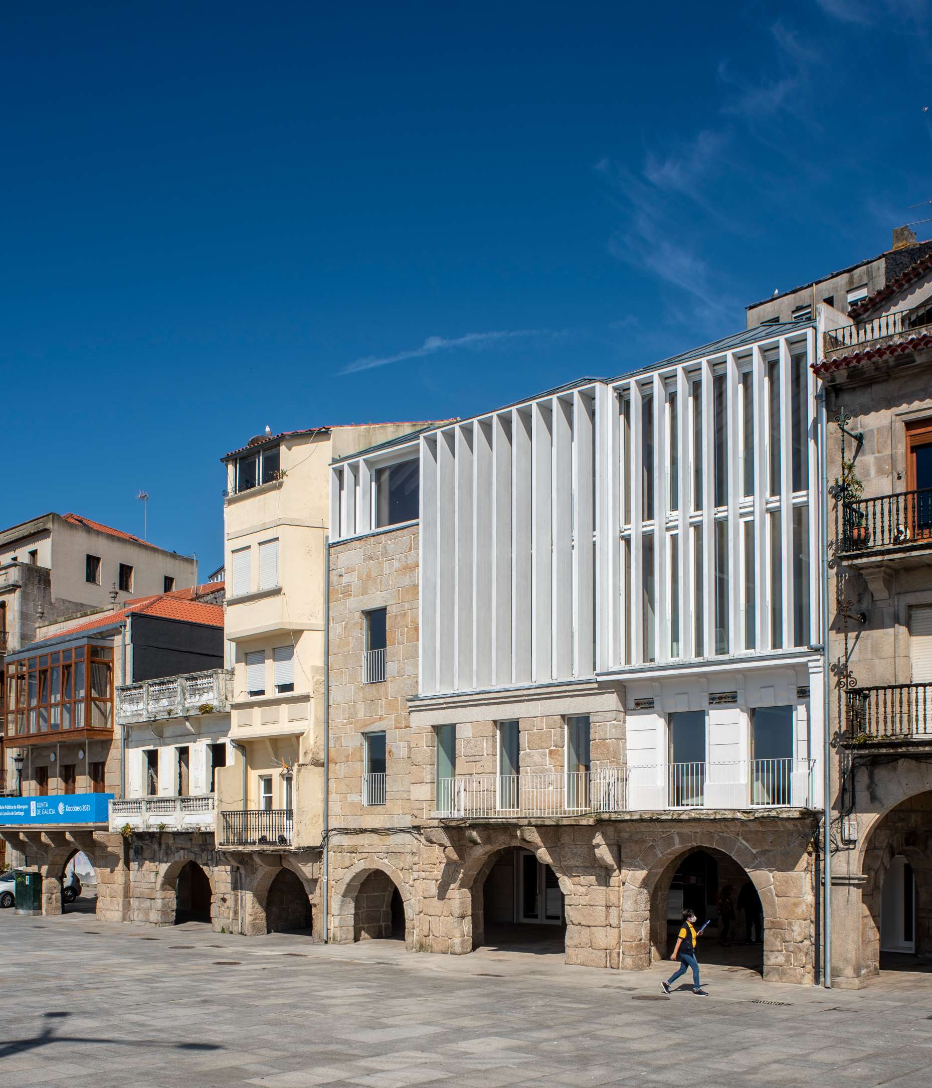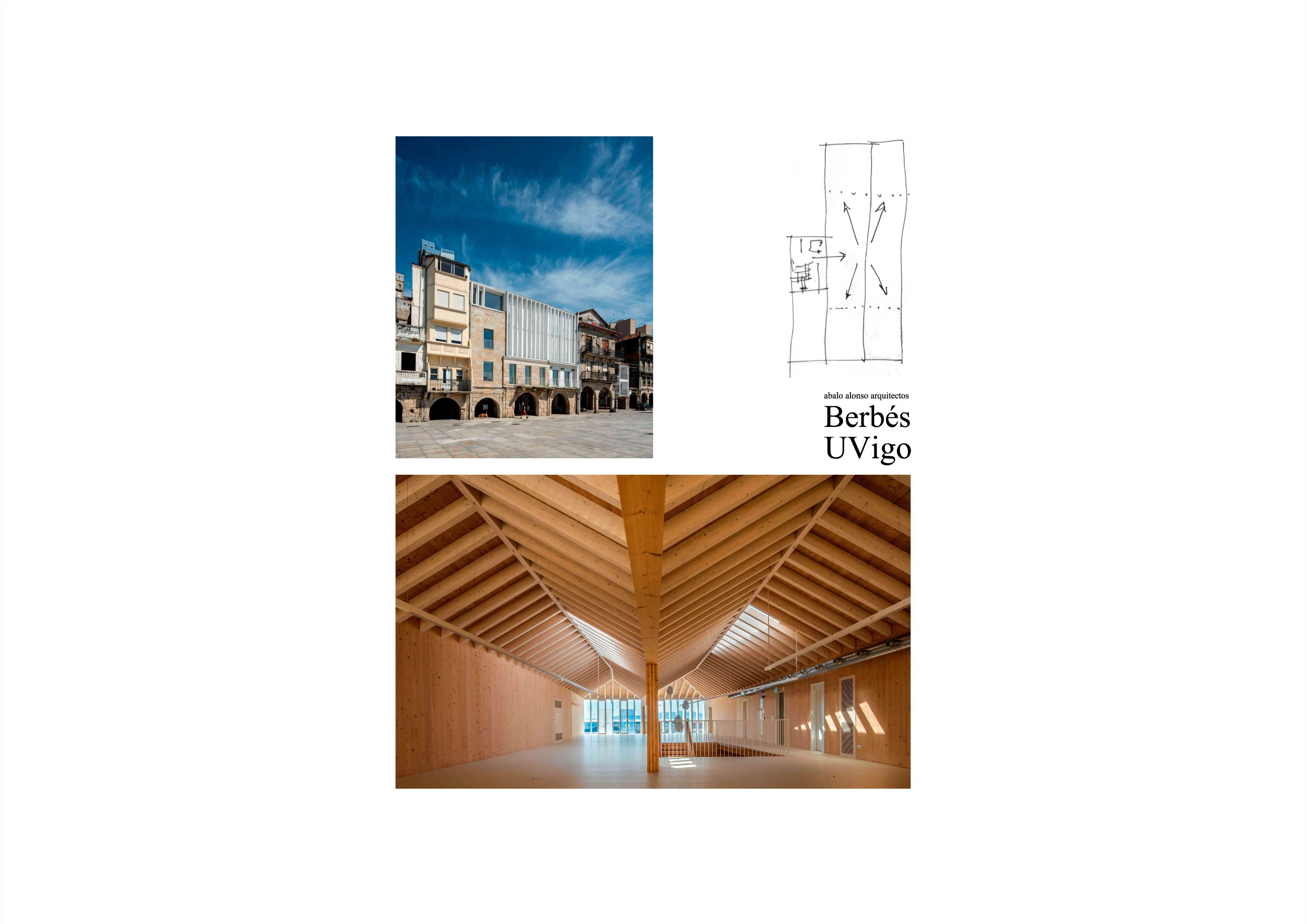 A universidade de Vigo, cuxo campus principal atópase a 10km do centro urbano, propón a rehabilitación de tres construcións no centro histórico co fin de achegar a súa actividade ao resto da sociedade. Un volume de madeira apóiase nos soportais de pedra existentes. Unha caixa dentro doutra; madeira e pedra. Neste caso, a caixa de madeira é enteira de madeira; estrutura e construción incluídas. Pero con sistemas industrializados contemporáneos, que optimizan o uso do material e a súa resposta temporal. Inspirámonos na construción naval tradicional, pero incorporamos os últimos avances en i+d, como corresponde ao destino do edificio que pretendemos desenvolver. A elección do material e o seu sistema construtivo permítenos integrarnos na tradición local sen renunciar a certa dose de contemporaneidade. No alzado oeste restauramos os soportais de pedra e as partes de fachada do mesmo material que aínda se conservan. Complétase a altura permitida polo plan especial cunha celosía de piares de madeira laminada que integra estrutura, protección solar e imaxe nun só elemento, coa verticalidade suxerida pola normativa e o sinal dun edificio institucional como o que nos ocupa. A fachada este, incrustada entre as plazoletas, patios e callejuelas interiores, resólvese dunha maneira similar, algo máis alixeirada pola redución do impacto solar. Esgótase a volumetría prevista na normativa, rematando o conxunto con tres cubertas lonxitudinais a catro augas de zinc, perforadas na zona central con dúas lucernarios que asolagan de luz norte o interior. Programa funcional flexible con espazos de traballo, reunión, exposición, información ou aulas, que se distribúen nas diferentes plantas. Do antigo parcelario, cuxa pegada se conserva, o volume máis pequeno acolle os espazos servidores. O resto distribúese nos outros dous.