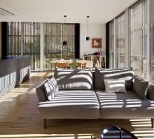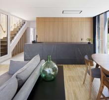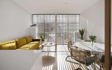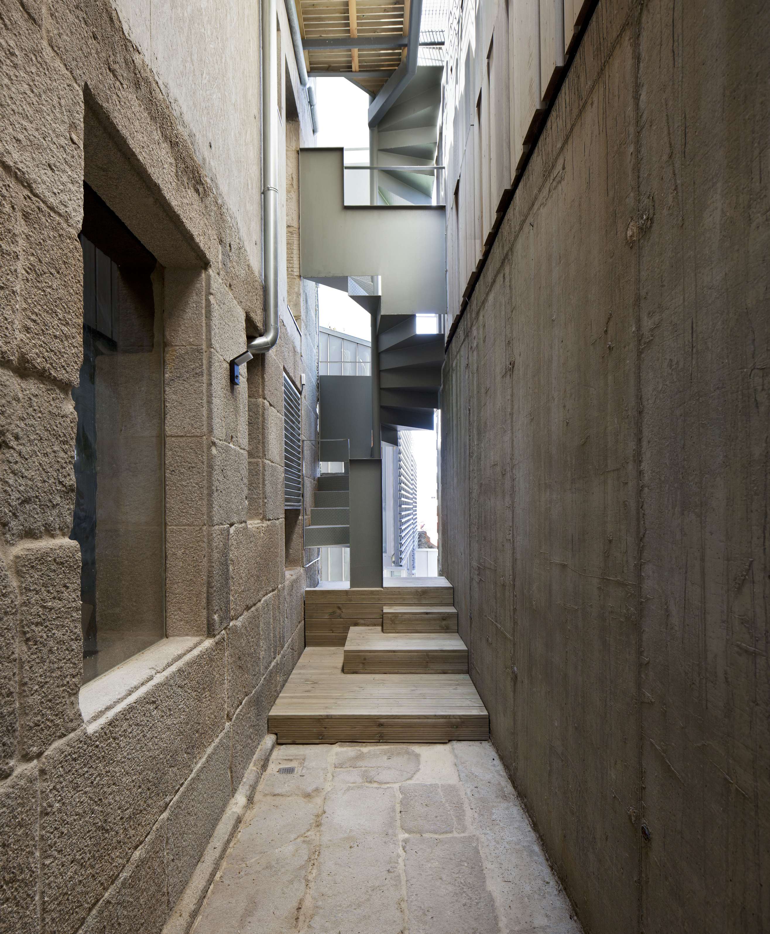 O proxecto, que ocupa unha situación limítrofe entre a escala humana das vivendas do Casco Histórico e o recinto amurallado de defensa da cidade, formaliza o cambio de escala mediante unha incisión practicada na fachada orixinal en continuidade coa ampliación da planta superior. O proxecto estende pola nova fachada un sistema de contraventás encartables, que permiten regular á demanda tanto a privacidade coma a exposición solar da vivenda. A fachada toma vida propia no movemento diario das pezas, facendo explícito un rexurdir da edificación. O emprego da madeira tratada en crudeza, enlaza o pasado e o futuro do Casco Vello sen fisuras, e polo tanto xustifica a colonización do resto da edificación, estendéndose hasta o baixo para acoller o acceso ao garaxe. Optamos polo tanto por unha solución de intervención de xesto firme e sinceridade construtiva palpable: o propio corte preciso para o acceso dos vehículos, imprescindible para favorecer unha RE-HABITACIÓN do Casco Vello non xentrificada, practícase á vista nun xesto unificado co engadido da planta superior. A solución conserva o ritmo tradicional de ocos, e salienta a contención do terreo que ofrece a propia edificación, á vez que formaliza unha nova escala para a edificación que se integra perfectamente no lugar. Funcionalmente, emprégase o patio traseiro coma espazo de comunicación vertical e horizontal. O acceso principal ás vivendas se produce dende o xardín da muralla na rúa Hortas. Baixo un teito acristalado se instala unha pasarela de madeira que da acceso individual ás dúas vivendas e, ao fondo, á escaleira de caracol que comunica co garaxe dous niveis por debaixo. Ambas vivendas aproveitan as vistas e maior iluminación da planta ampliada para situar á area de día. A luz accede filtrada ao interior a través das lamas de madeira, empregando coma equilibrio lumínico as escaleiras de saída ás terrazas. Os sistema de contraventás alcanza perfectamente o seu obxectivo: regulación de temperatura e privacidade. Un interior no que ver sen ser visto, gozando dun xardín privilexiado con vistas no centro da cidade. As vivendas encáixanse nun quebracabezas dimensional cun condicionante estrutural: a non aparición de piares centrais para dispoñer dunha manobra óptima para os coches. Para isto deseñouse unha viga-muro separando ambas vivendas na planta segunda e servindo de soporte aos forxados superiores. Ambas escaleiras se aproveitan en toda a súa altura para acoller espazos de almacenamento e servizo das vivendas. Os dormitorios se sitúan prioritariamente con fiestras á fachada principal. Empréganse acabados en madeira de carballo e revestimentos continuos de cal e arxilas naturais, contrastando con exteriores en pedra, formigón e aceiro galvanizado, co contrapunto das carpintarías e contraventás de madeira.