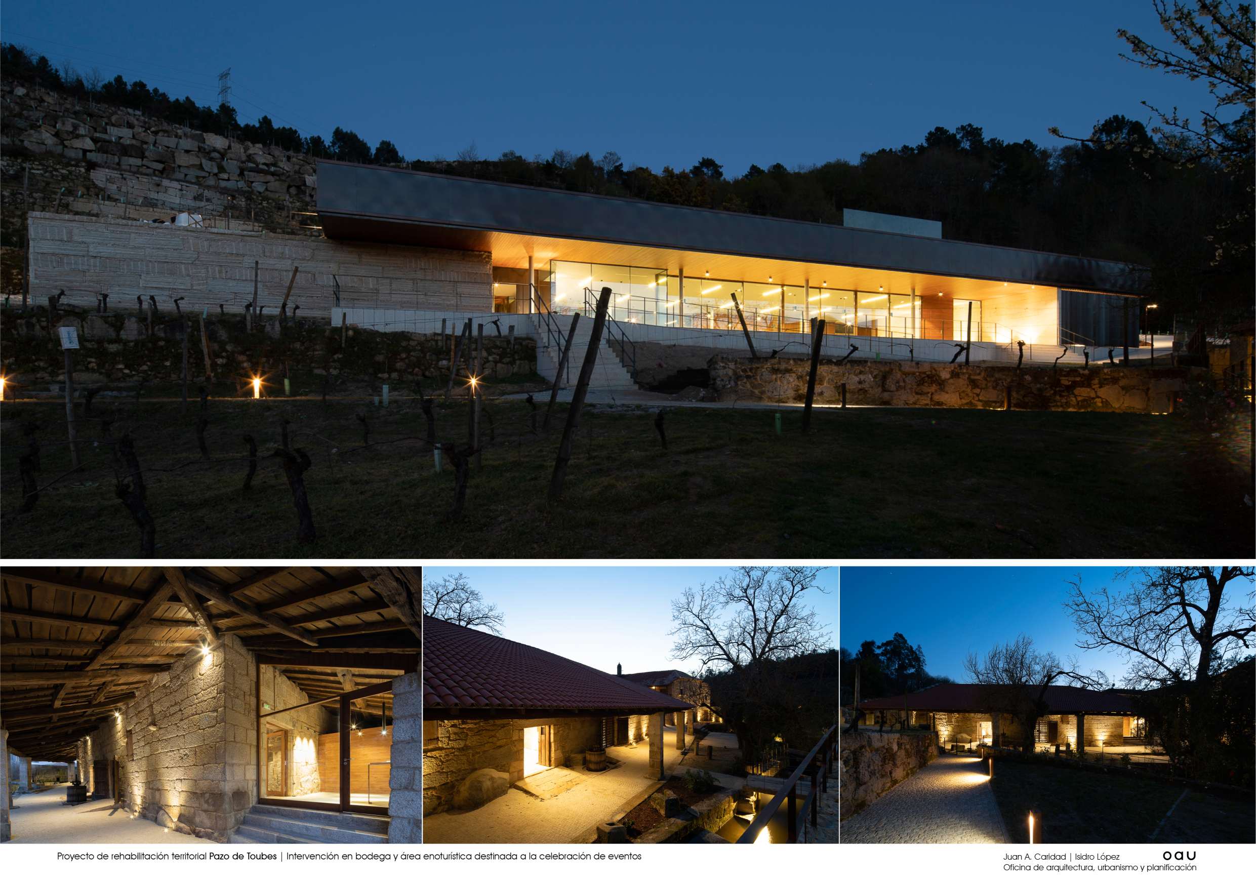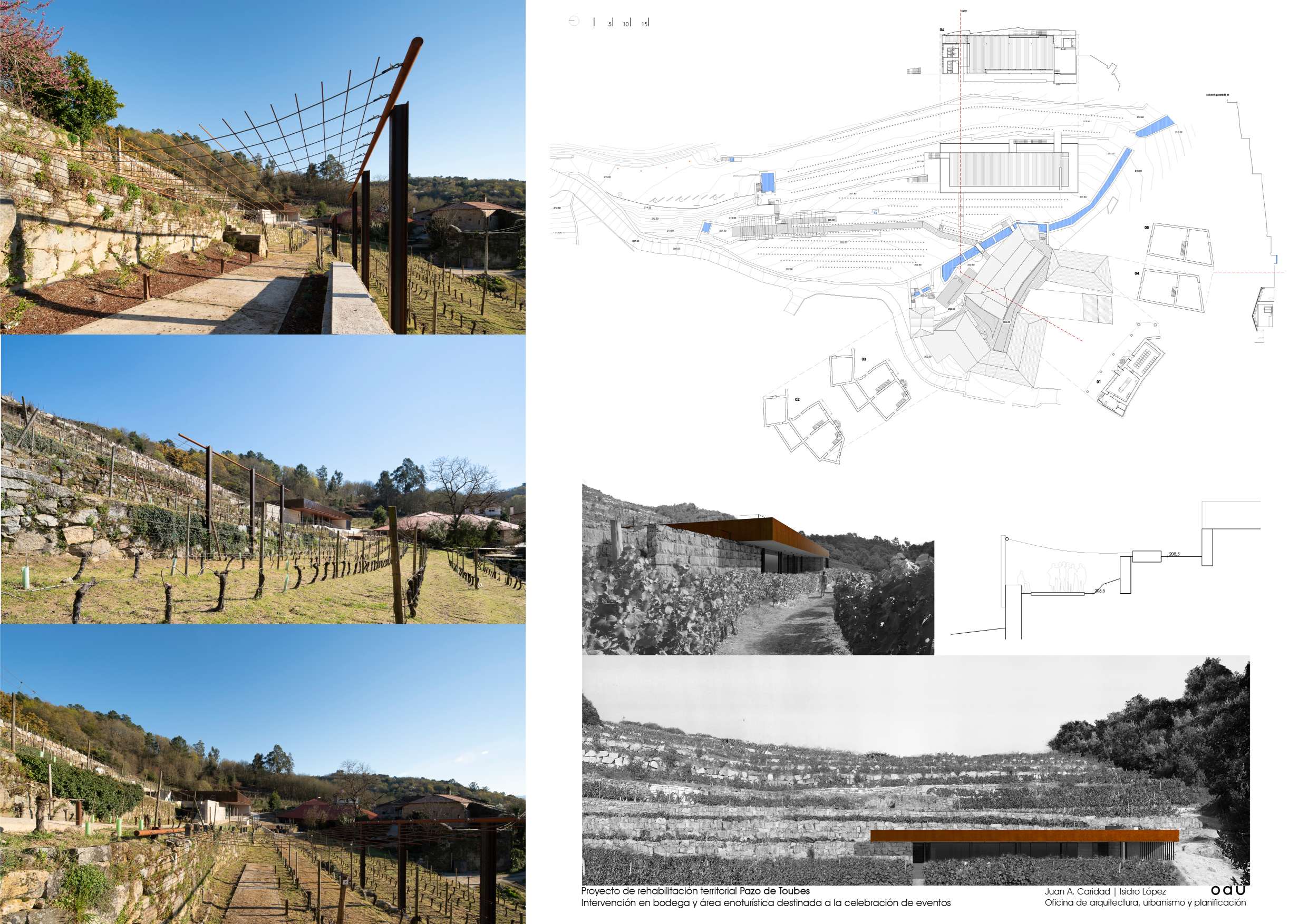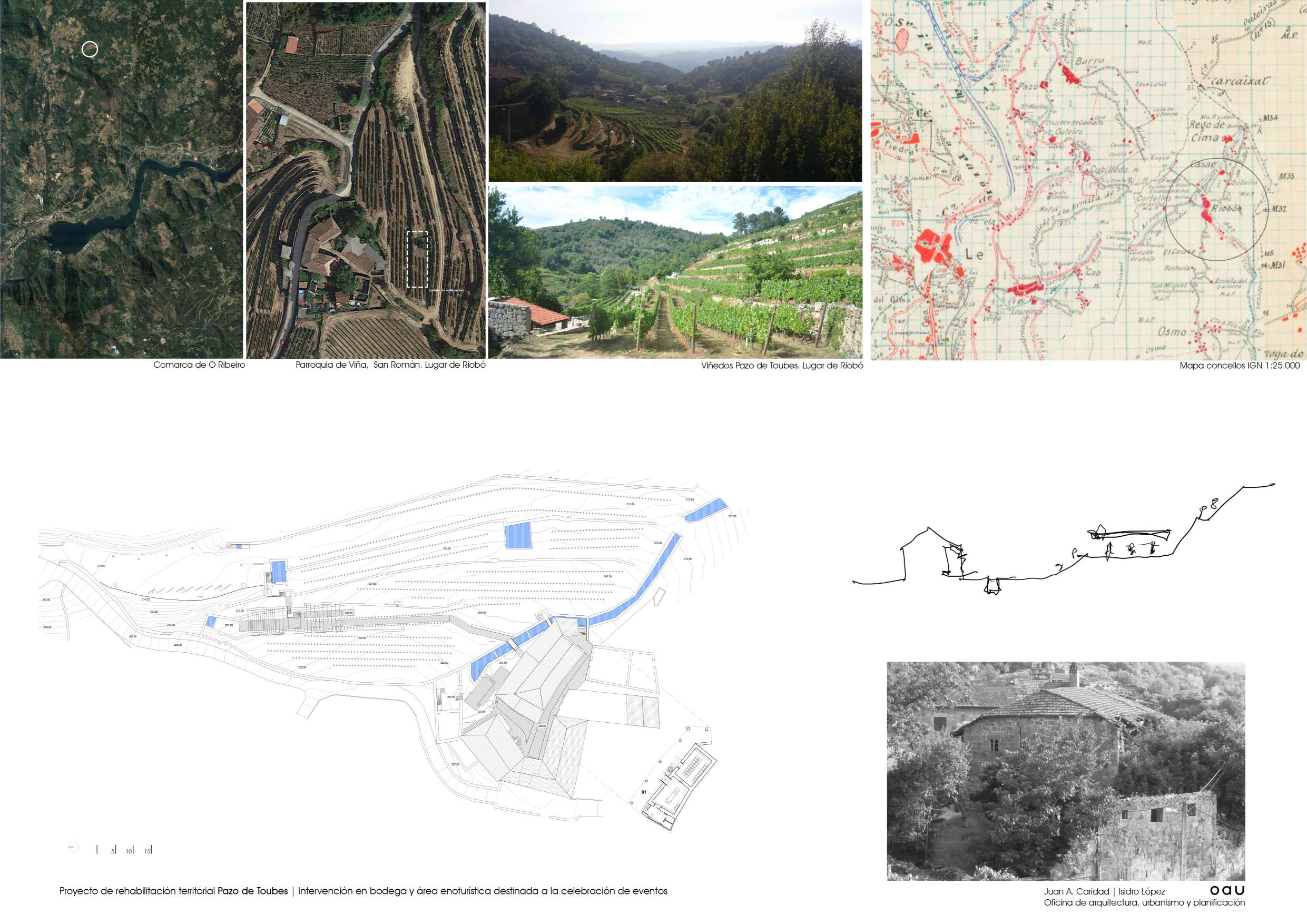 O conxunto do Pazo de Toubes encóntrase no lugar de Riobó,parroquia de San Miguel de Osmo, Concello de Cenlle e comarca do Ribeiro. En Ourense. Moitas organizacións territoriais, moita historia, moitas vidas individuais e moitas paisaxes superpostas. As edificacións centrais, moi alteradas, databan do século XVIII. Tiñan nome: “Pazo dos Toubes” ou “Casa do Outeiro”. Xa o Marqués da Ensenada recollíao no seu catastro…unha casa nun alto, coa súa cociña, cabaleiriza e bodega terrena no lugar de Outeiro. E todo entre viñas e socalcos, dominando o val do Avia, ao que desde a Casa Grande, chegaba a auga dun regato innominado pero construído con sillares de granito. ¡Se don Alvaro Cunqueiro levantara cabeza… chamarlle a un río en Galicia innominado! o lugar tiña Memoria cando chegamos. Era imprescindible escoitala. Falaba de pedra, de auga e de vide. Ulía a viño e a viñedo. A Casa Grande, a bodega e o lagar constituían o centro da parcela pacega. Pequenos elementos de valor arquitectónico, pontellas, muros, fontes, escudos…, esculpidos ou labrados mostraban unha paisaxe culta, dura pero amable. O Plan Xeral con bo criterio, establecera unhas poucas regras para que o que se fixese, se fixese con sentidiño. A xente de Viña Costeira confiou en nós para intervir e ante isto so cabía actuar con responsabilidade, utilizando o oficio de Arquitecto como ferramenta. Xa se levaran adiante algunhas actuacións entón, a consolidación inacabada de parte da bodega, a construción de novos socalcos que contrastaban cos tradicionais. O estado constructivo do conxunto era deficiente, amenazaba ruína e o que era máis preocupante, amenazaba perda. Contábamos cun buen aparellador, ─que palabra tan importante esa de aparellar─, e operarios que coñecían o seu oficio. Eran datos que había que asumir o aproveitar. A Cooperativa quería rehabilitar o conxunto e dotalo de nova actividade. Unha restauración sen uso non é sostible. O propósito pareceunos axeitado, sensato. Inicialmente tratouse máis dunha estratexia que dun proxecto arquitectónico: acometer a actuación con carácter global, pero desde o fragmentario para facela sostible. A partir de alí definiuse o programa. Tratábase de integrar a convivencia do uso produtivo vencellado ao viño, con otros usos complementarios, en especial o enoturístico; recuperar a bodega tradicional como espazo de maduración e cata; recuperar tamén, o contorno desta bodega para o seu funcionamento integrado no conxunto; limpar e ordenar os socalcos en producción próximos ao edificado e facelos accesibles, para que novos usuarios poidesen disfrutalos en convivencia cos usos produtivos; necesitábase, como condición indispensable, xerar un espazo de amplas dimensións para a celebración de eventos, que permitise manter economicamente a actuación, sen violentar a paisaxe; era imprescindible a consolidación das edificacións do Pazo das que se dispoñía, para preservar as súas características construtivas, e poder actuar sobre elas no futuro. A idea de proxecto foi completar o lugar, pregarse a el e a súa Memoria e dar resposta ordenada ás funcións que debían producirse. Os materiais e as técnicas construtivas debían ser as adecuadas a cada actuación; tradicionais ou contemporáneas segundo o caso.