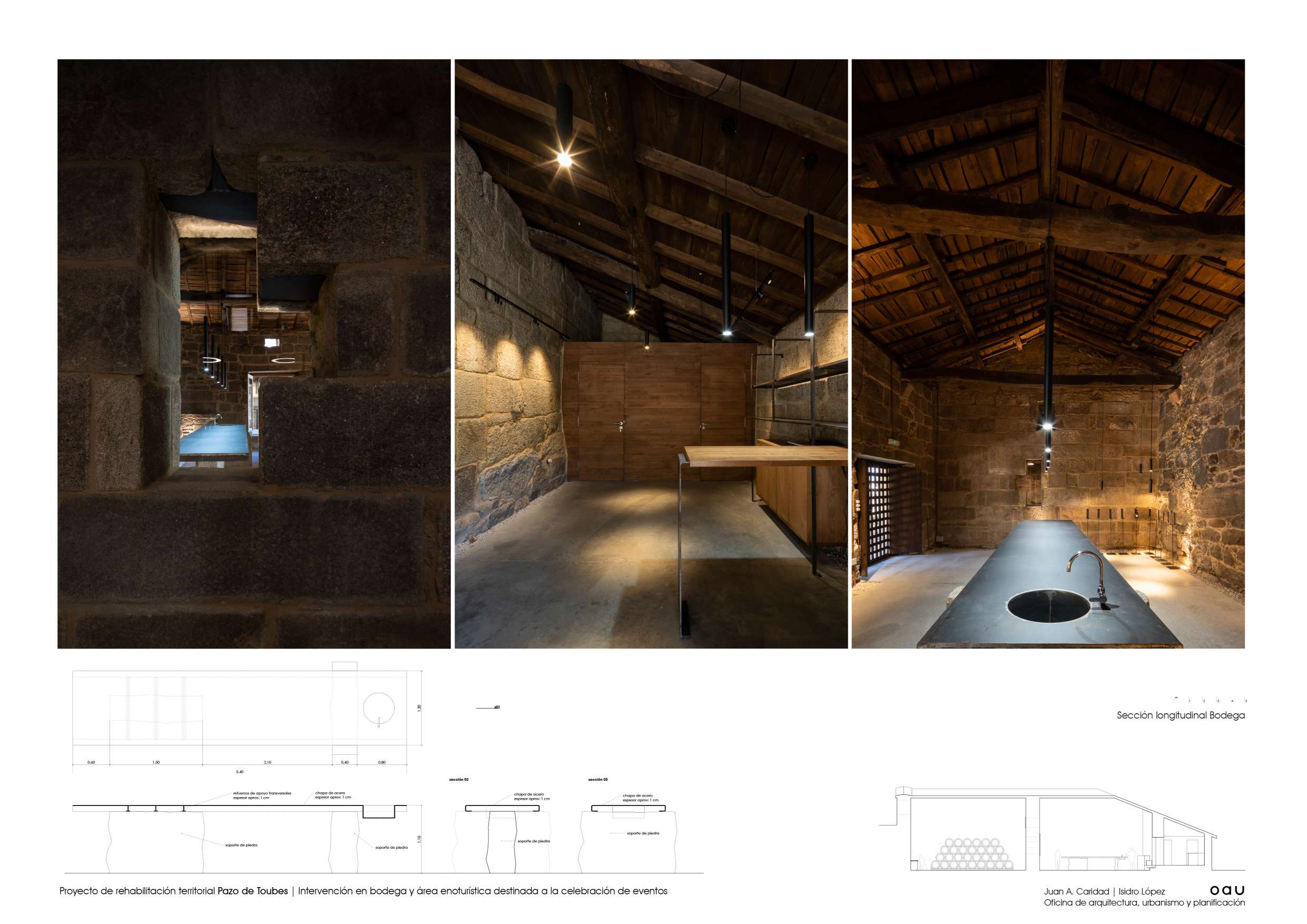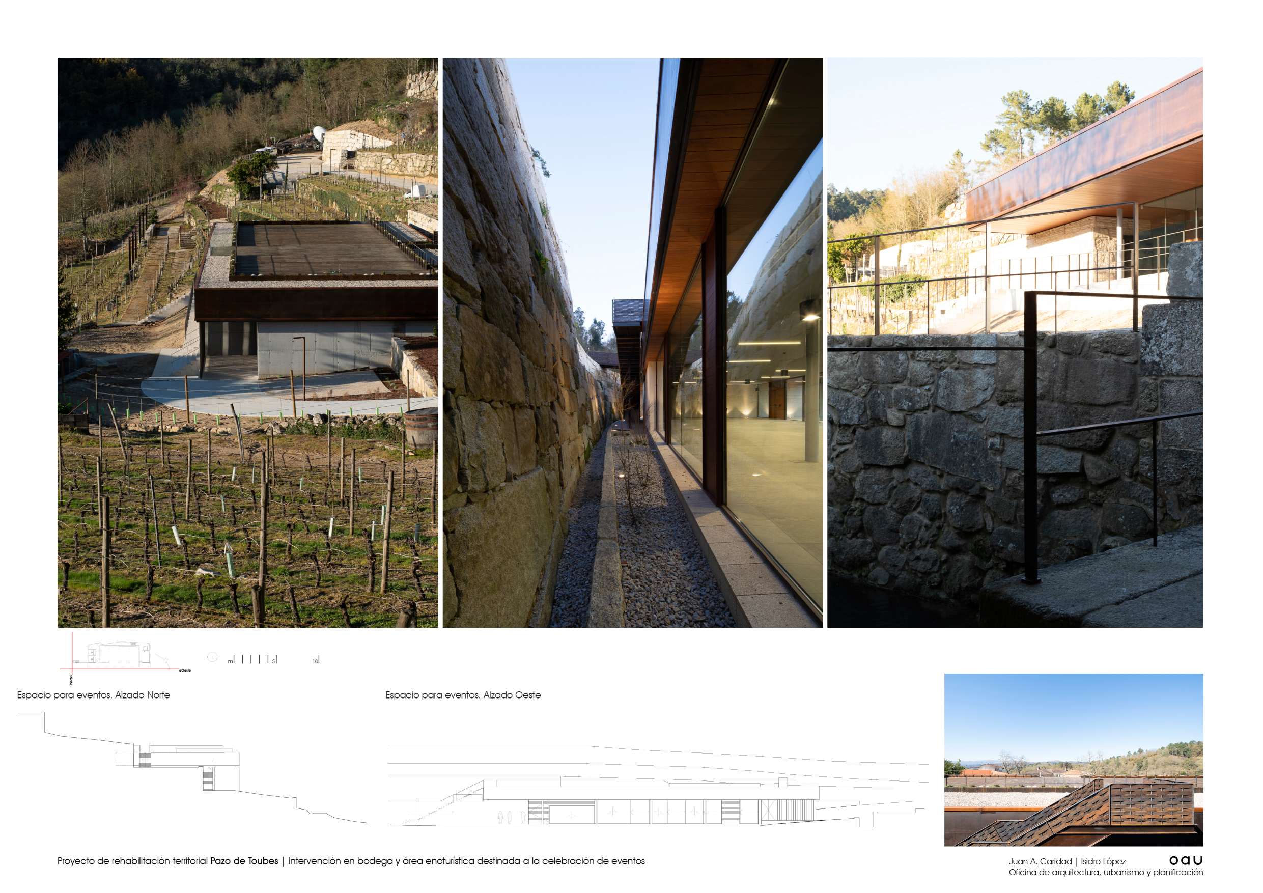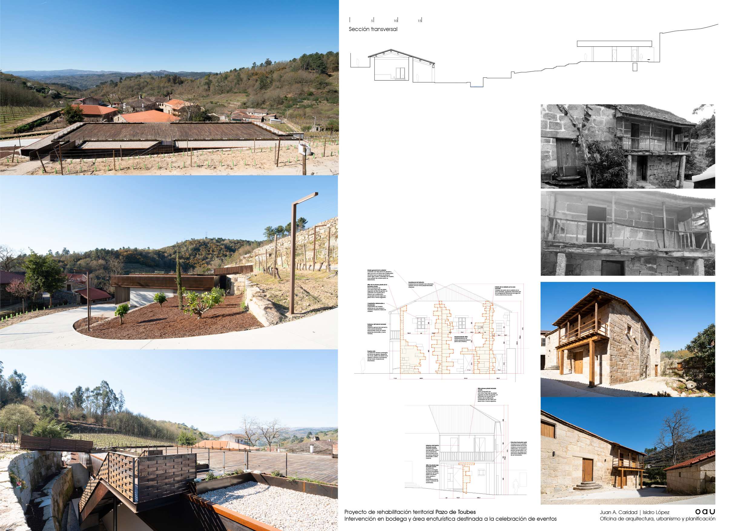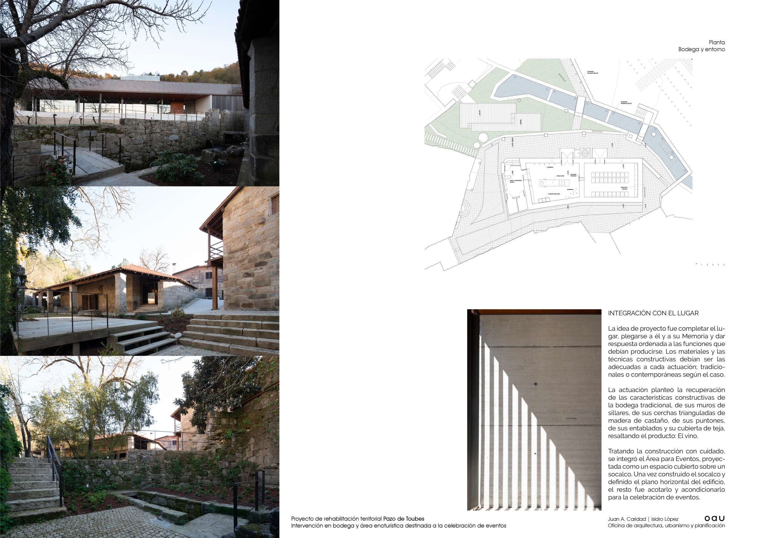 O conxunto do Pazo de Toubes encóntrase no lugar de Riobó,parroquia de San Miguel de Osmo, Concello de Cenlle e comarca do Ribeiro. En Ourense. Moitas organizacións territoriais, moita historia, moitas vidas individuais e moitas paisaxes superpostas. As edificacións centrais, moi alteradas, databan do século XVIII. Tiñan nome: “Pazo dos Toubes” ou “Casa do Outeiro”. Xa o Marqués da Ensenada recollíao no seu catastro…unha casa nun alto, coa súa cociña, cabaleiriza e bodega terrena no lugar de Outeiro. E todo entre viñas e socalcos, dominando o val do Avia, ao que desde a Casa Grande, chegaba a auga dun regato innominado pero construído con sillares de granito. ¡Se don Alvaro Cunqueiro levantara cabeza… chamarlle a un río en Galicia innominado! o lugar tiña Memoria cando chegamos. Era imprescindible escoitala. Falaba de pedra, de auga e de vide. Ulía a viño e a viñedo. A Casa Grande, a bodega e o lagar constituían o centro da parcela pacega. Pequenos elementos de valor arquitectónico, pontellas, muros, fontes, escudos…, esculpidos ou labrados mostraban unha paisaxe culta, dura pero amable. O Plan Xeral con bo criterio, establecera unhas poucas regras para que o que se fixese, se fixese con sentidiño. A xente de Viña Costeira confiou en nós para intervir e ante isto so cabía actuar con responsabilidade, utilizando o oficio de Arquitecto como ferramenta. Xa se levaran adiante algunhas actuacións entón, a consolidación inacabada de parte da bodega, a construción de novos socalcos que contrastaban cos tradicionais. O estado constructivo do conxunto era deficiente, amenazaba ruína e o que era máis preocupante, amenazaba perda. Contábamos cun buen aparellador, ─que palabra tan importante esa de aparellar─, e operarios que coñecían o seu oficio. Eran datos que había que asumir o aproveitar. A Cooperativa quería rehabilitar o conxunto e dotalo de nova actividade. Unha restauración sen uso non é sostible. O propósito pareceunos axeitado, sensato. Inicialmente tratouse máis dunha estratexia que dun proxecto arquitectónico: acometer a actuación con carácter global, pero desde o fragmentario para facela sostible. A partir de alí definiuse o programa. Tratábase de integrar a convivencia do uso produtivo vencellado ao viño, con otros usos complementarios, en especial o enoturístico; recuperar a bodega tradicional como espazo de maduración e cata; recuperar tamén, o contorno desta bodega para o seu funcionamento integrado no conxunto; limpar e ordenar os socalcos en producción próximos ao edificado e facelos accesibles, para que novos usuarios poidesen disfrutalos en convivencia cos usos produtivos; necesitábase, como condición indispensable, xerar un espazo de amplas dimensións para a celebración de eventos, que permitise manter economicamente a actuación, sen violentar a paisaxe; era imprescindible a consolidación das edificacións do Pazo das que se dispoñía, para preservar as súas características construtivas, e poder actuar sobre elas no futuro. A idea de proxecto foi completar o lugar, pregarse a el e a súa Memoria e dar resposta ordenada ás funcións que debían producirse. Os materiais e as técnicas construtivas debían ser as adecuadas a cada actuación; tradicionais ou contemporáneas segundo o caso.