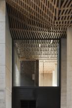 A peza elévase para que o espazo libre poida seguir fluíndo ata atopar un patio interior con árbores que nos fala de natureza.