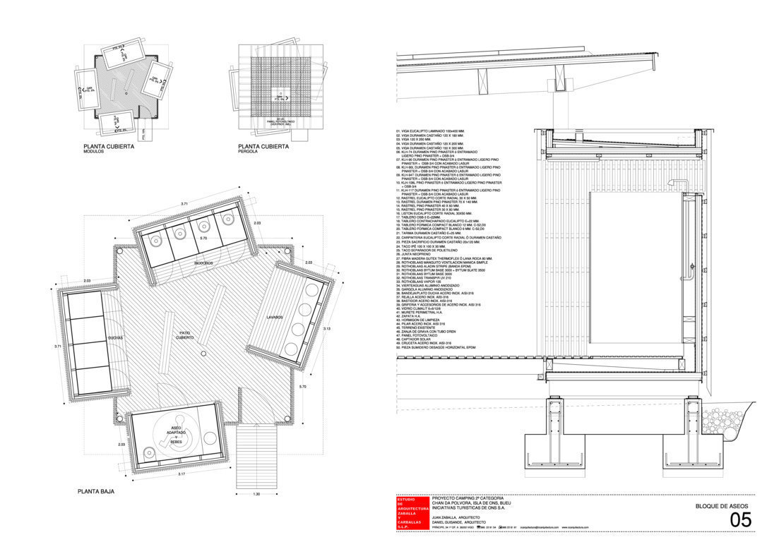 Igualmente la construcción es toda de madera excepto la cimentación –hormigón- y los pilares de las pérgolas –acero inox-. El uso masivo de madera supone también disminuir el balance de generación de co2 en el total de fabricación-construcción.
