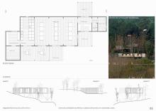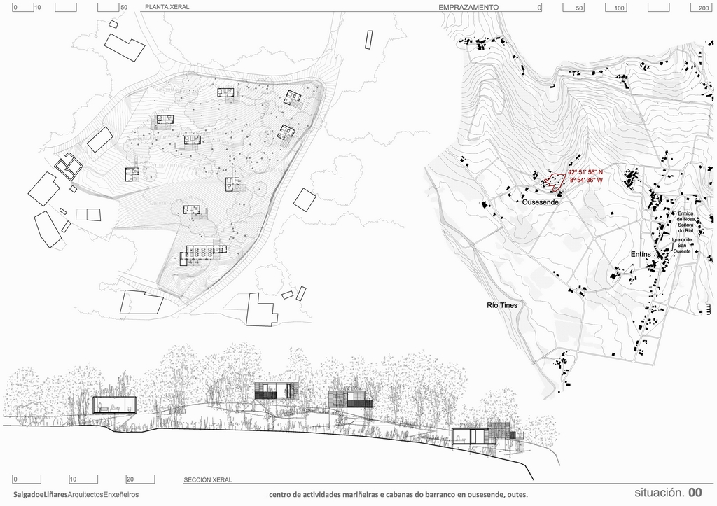 A nivel global, se realiza una primera aproximación a la parcela desde su sección. Conseguimos unas primeras manchas asomándonos a los diferentes bordes y haciendo nuestros los terrenos circundantes, liberando espacio y buscando la intimidad de cada edificación sin renunciar a una sorprendente perspectiva, entre las ramas, sobre la desembocadura del Rio Tines, los montes Barbanza, Trémuzo y A Pena, y el nacimiento de la ría de Muros-Noia.