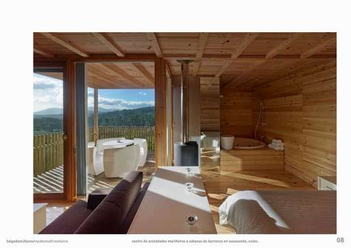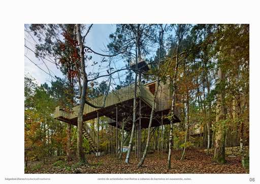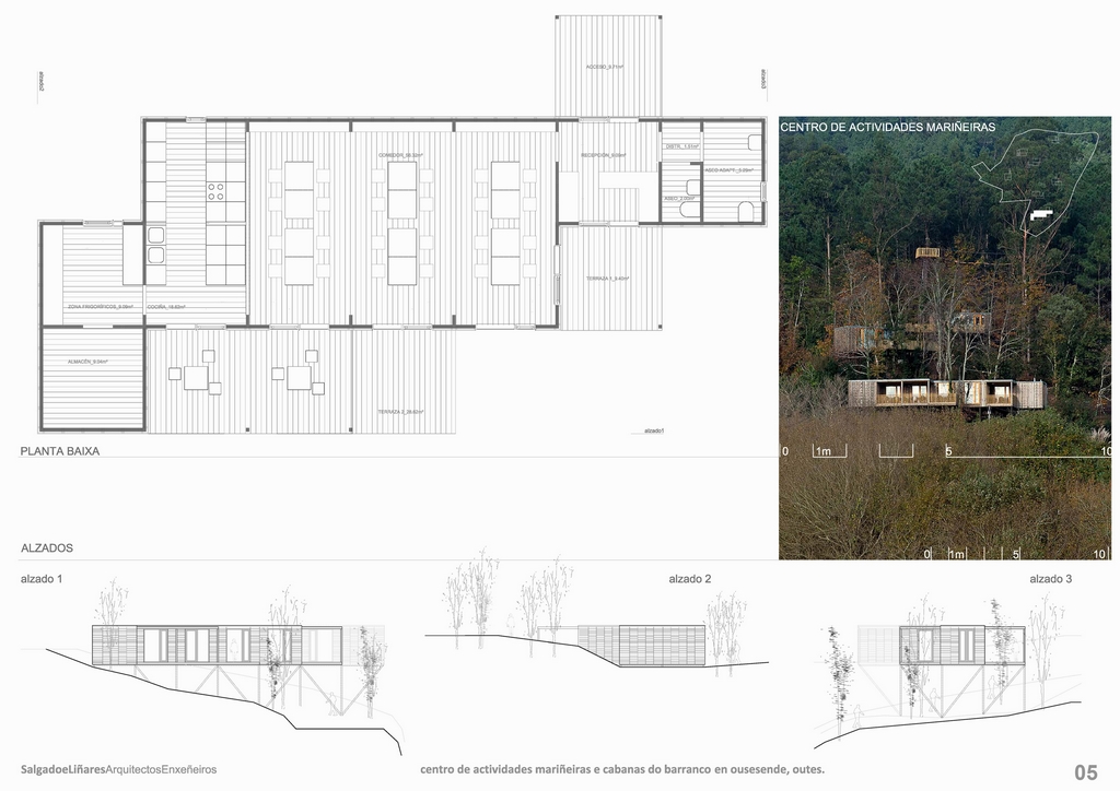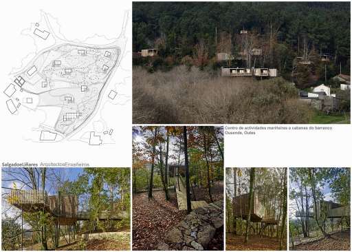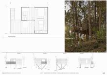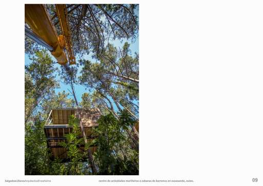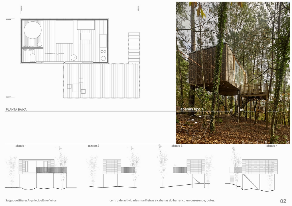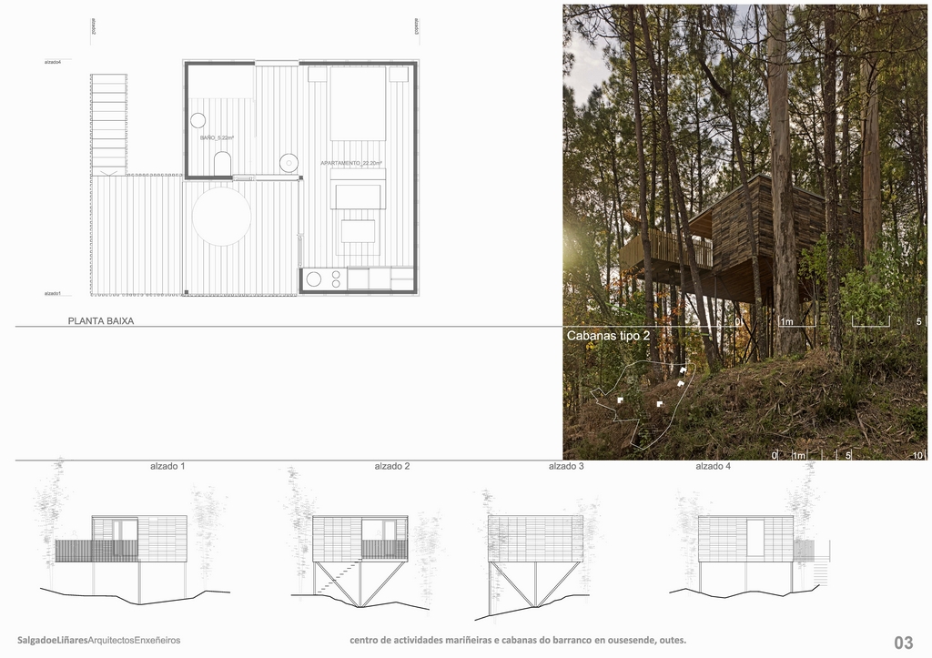 En un tercer nivel, se definen las apoyos sobre los que soportar las ligeras estructuras de madera sin dañar las raíces de los diferentes árboles entre los que se integran, se definen también las alturas de las diferentes edificaciones y los accesos, buscando difuminar la línea entre edificación y entorno, natural y artificial.